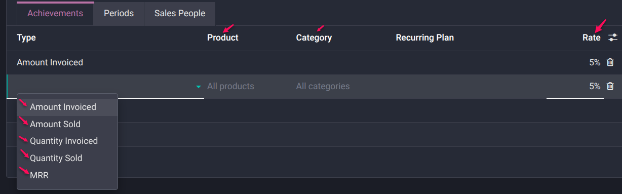 Odoo allows you to calculate commissions using different performance metrics: