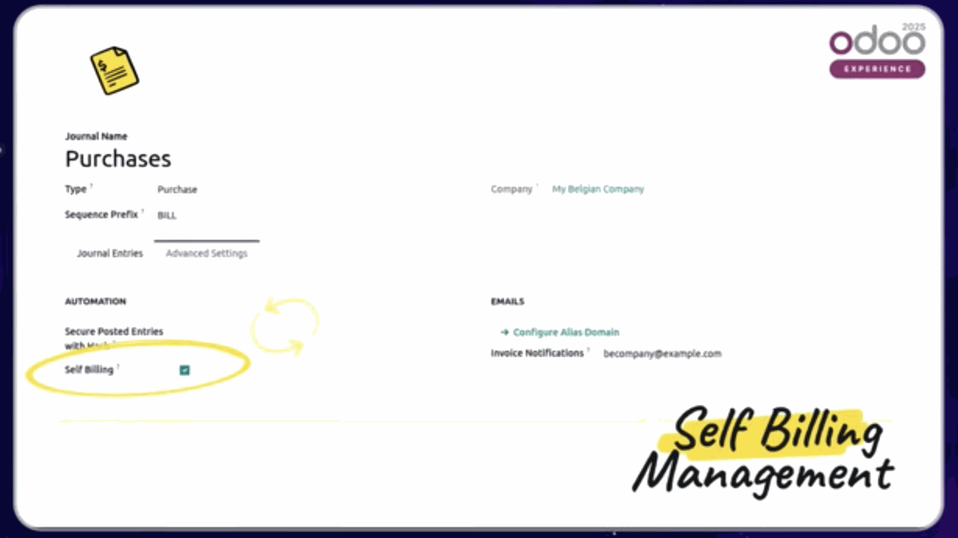 Another groundbreaking feature in Odoo 19 is the introduction of Self-Billing Management. This allows a customer to create the invoice on behalf of their supplier and send it to them for verification. This process, also known as evalu-ated receipt settlement (ERS), streamlines the procurement-to-pay cycle, reduces administrative overhead, and strengthens supplier relationships.