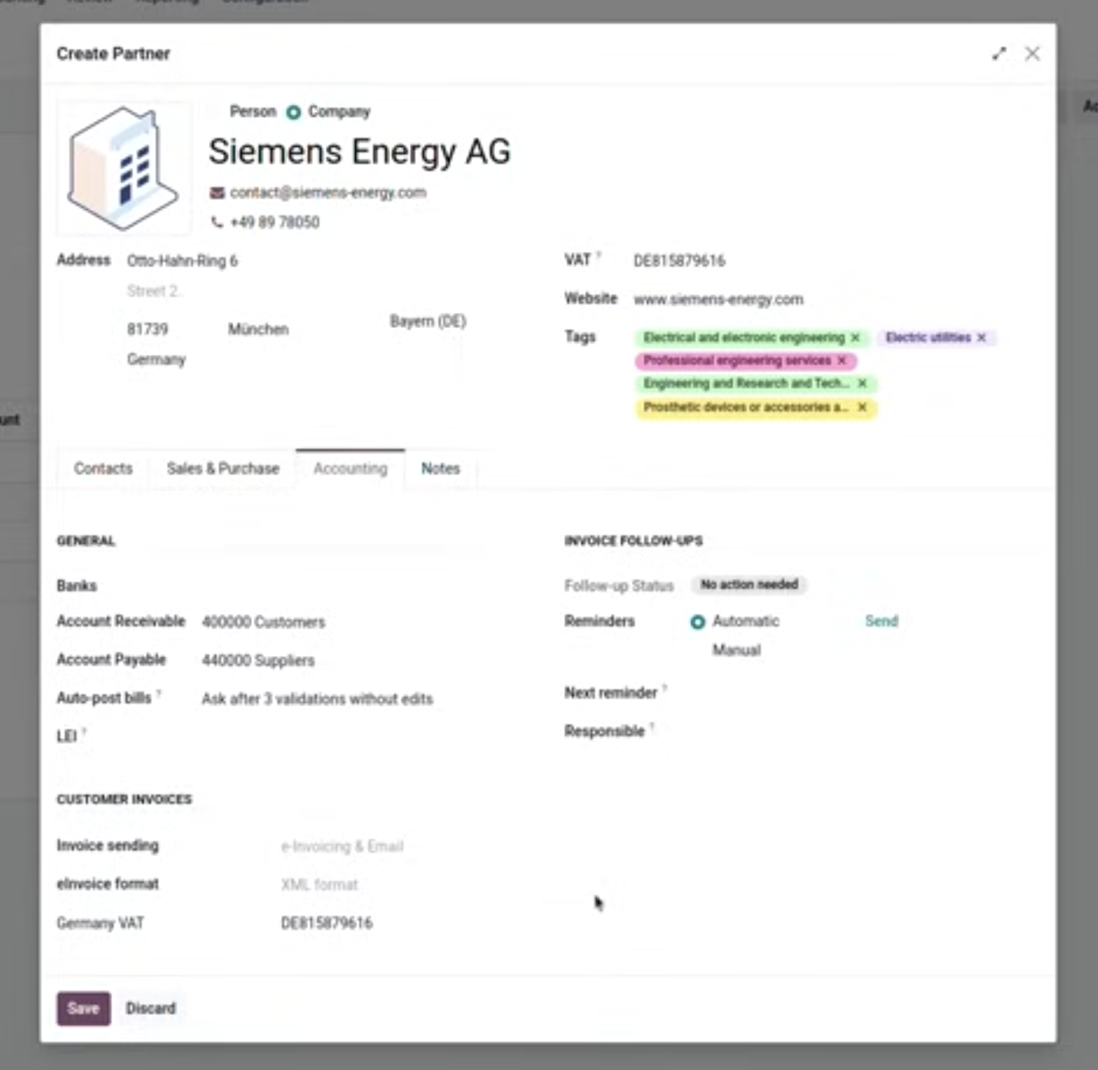 Odoo 19 also enhances partner management with more granular control over invoicing processes. The “Create Partner” screen now includes options for configuring automated invoice follow-ups, ensuring timely payment reminders are sent without manual intervention. This proactive approach to accounts receivable management helps to reduce late payments and improve overall financial health.
