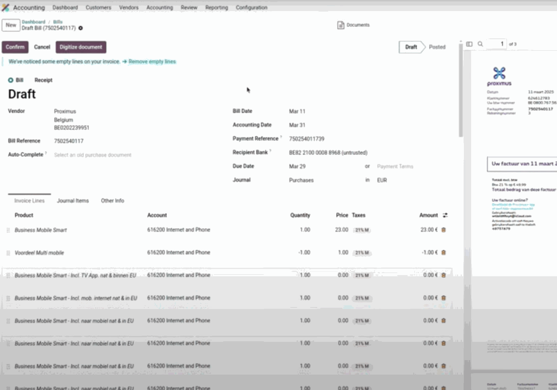 The system's ability to digitise bills using Optical Character Recognition (OCR) technology further streamlines the accounts payable process. As seen in the screenshot below, Odoo can extract relevant information from a scanned or PDF invoice, such as the vendor, bill reference, and line items, and automatically populate the corresponding fields in the system. This significantly reduces the time and effort required to process incoming invoices.